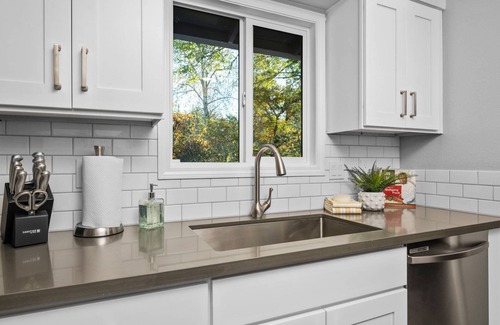 Upon entry you are greeted with a split level concept where the upper floor boasts an open living and dining layout that sits adjacent to the fully stocked kitchen. Just down the hall there is a full bath shared with two of the bedrooms, while the third upper bedroom has an en-suite bathroom. The Springwater Escape recently received a number of upgrades and enhancements. Every bit of furnishing and décor is brand new and was curated to help create that perfect blend of comfort and style for your stay.